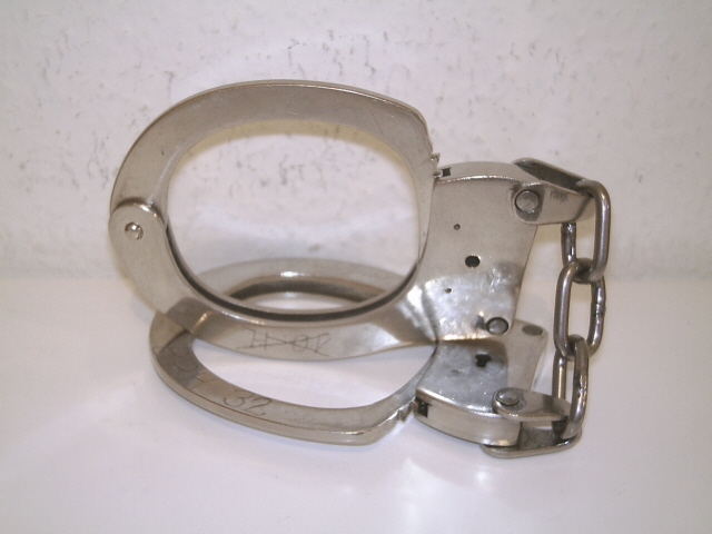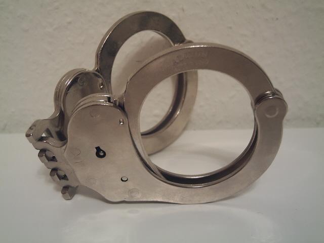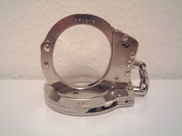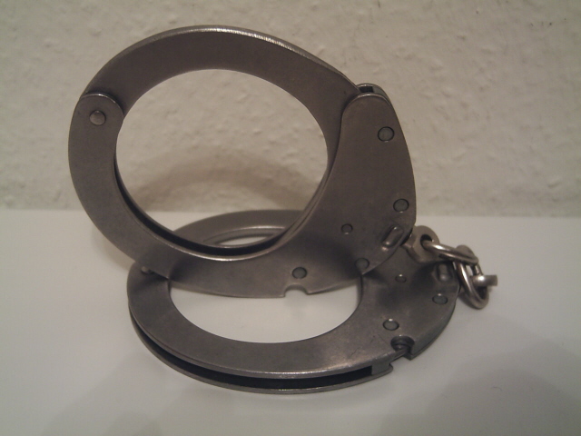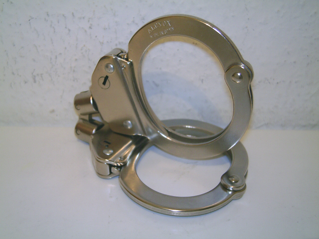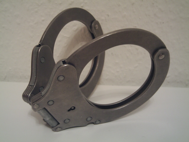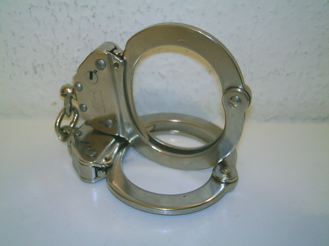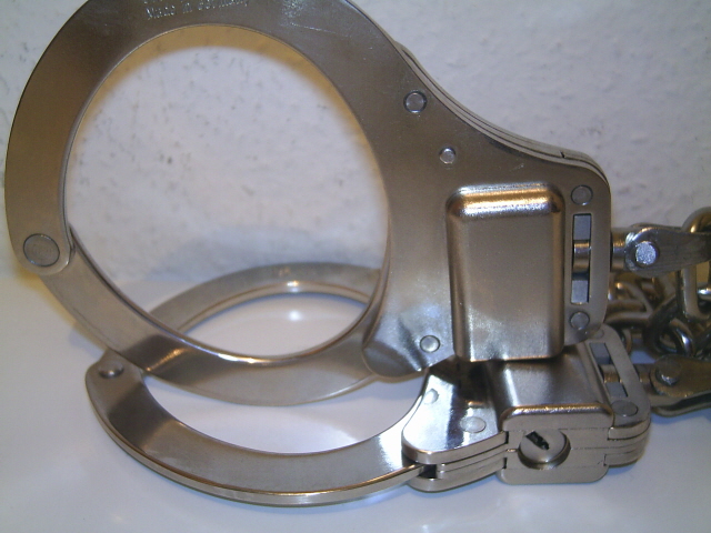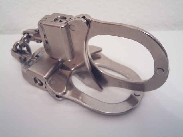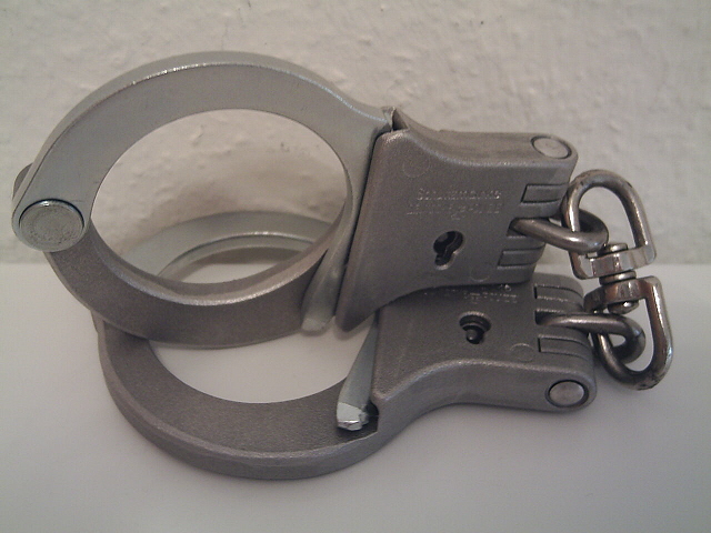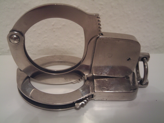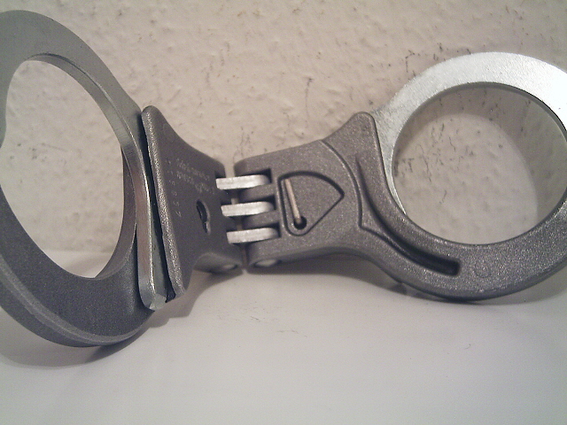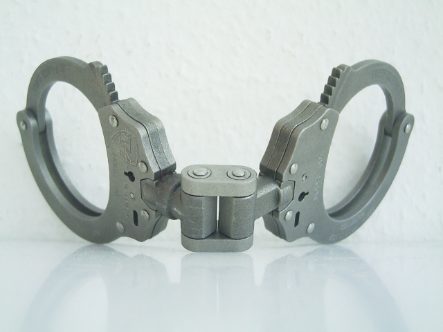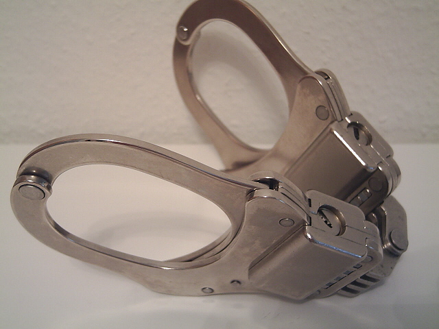 Moderne, zeitgemäße Handschellen im aktuellen Gebrauch mit flachem Gehäuse und durchschwingenden Zahnbügeln, die in eine Ratsche einrasten. Viele Modelle haben Besonderheiten was Optik oder Technik anbelangt.