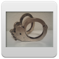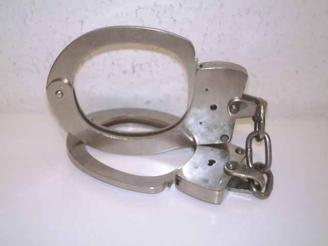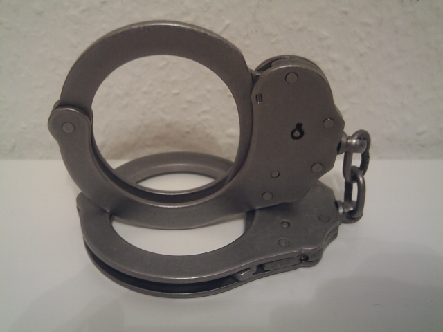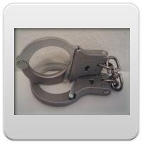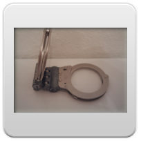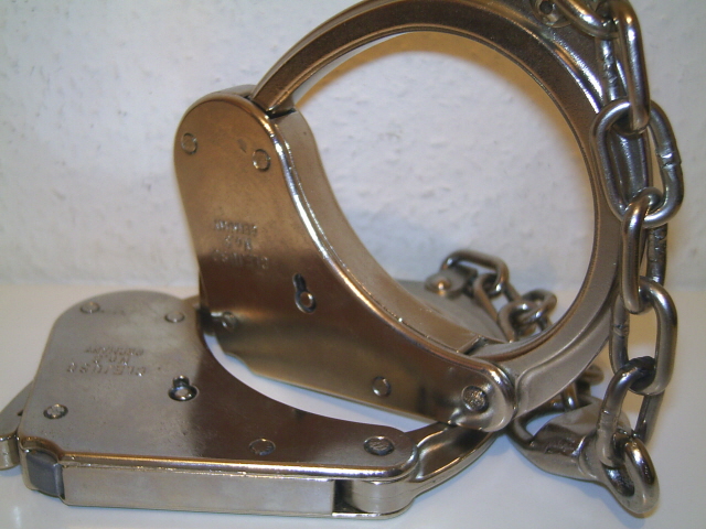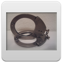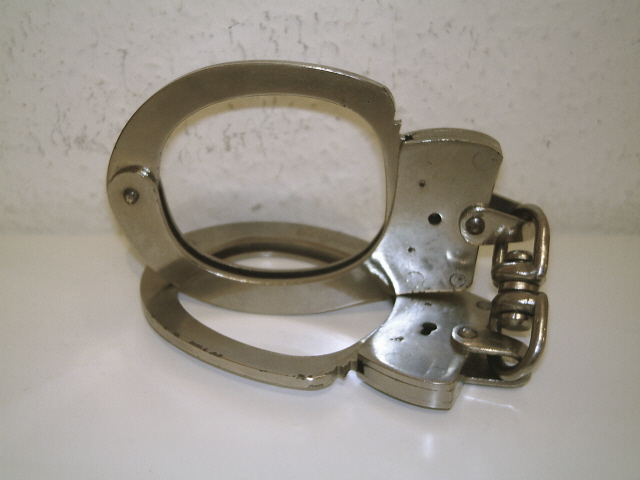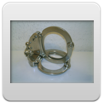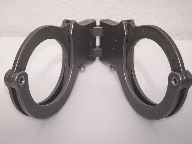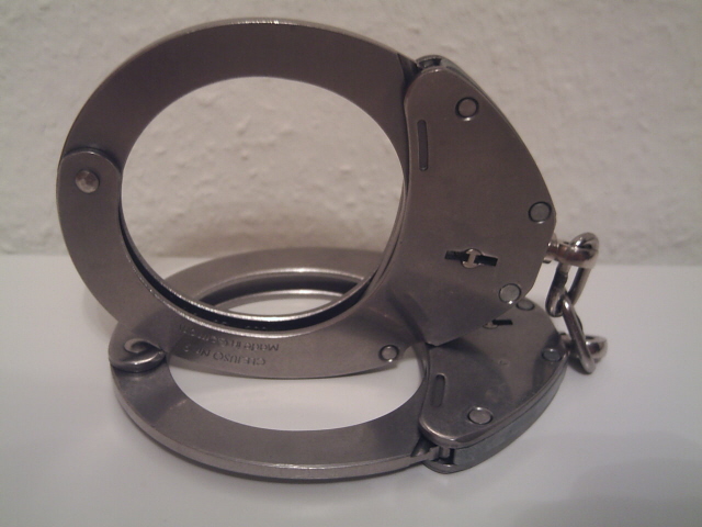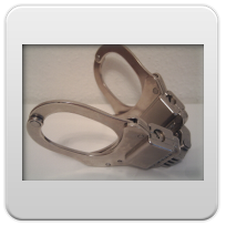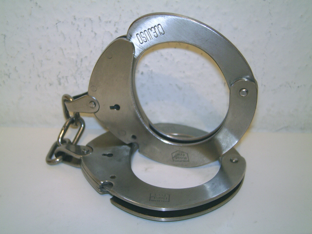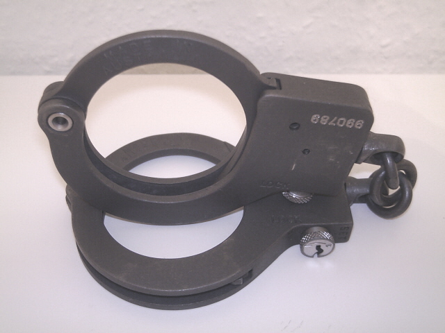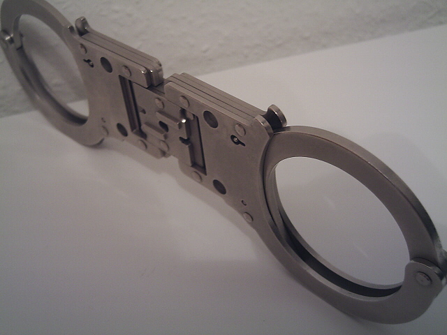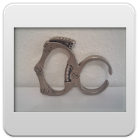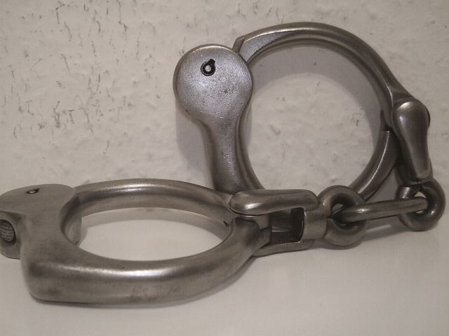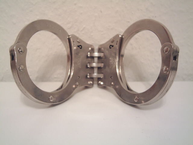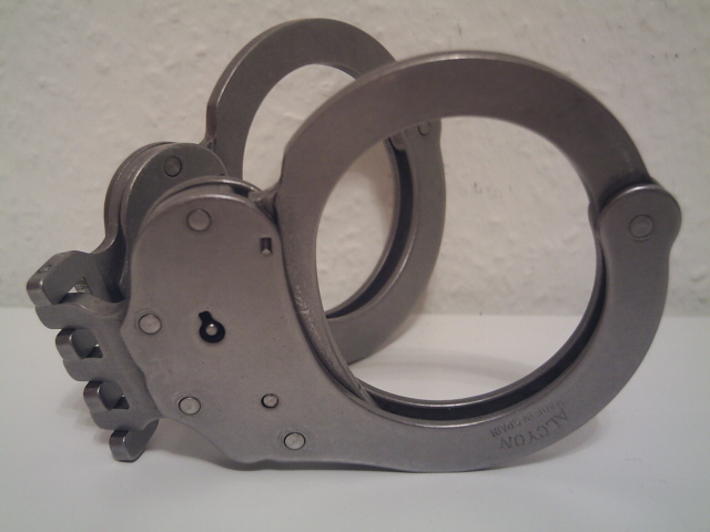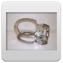 Moderne, zeitgemäße Handschellen im aktuellen Gebrauch mit flachem Gehäuse und durchschwingenden Zahnbügeln, die in eine Ratsche einrasten. Viele Modelle haben Besonderheiten was Optik oder Technik anbelangt.