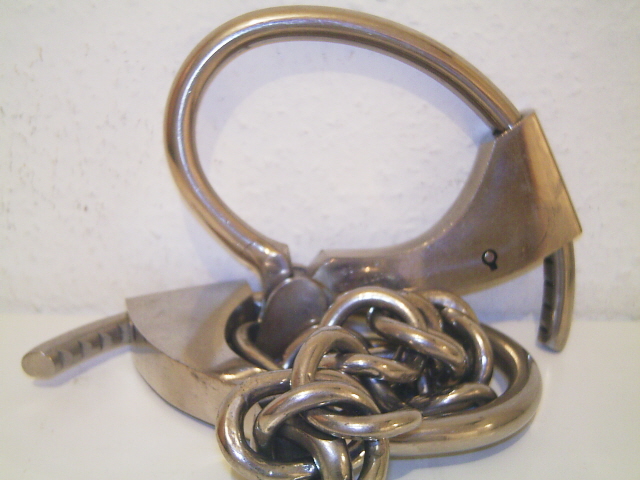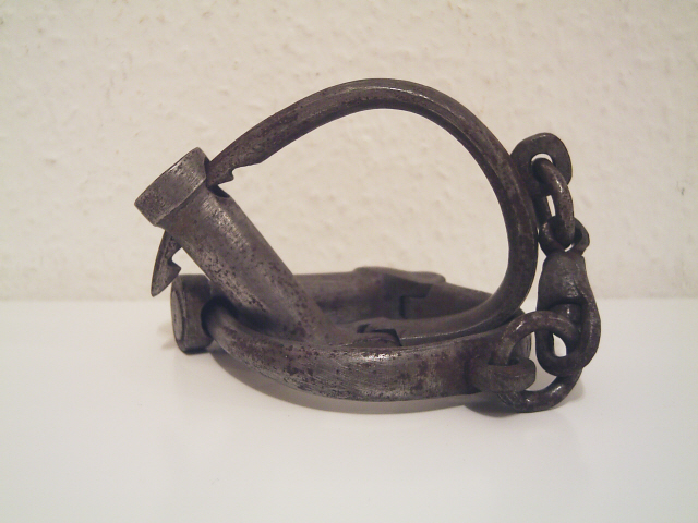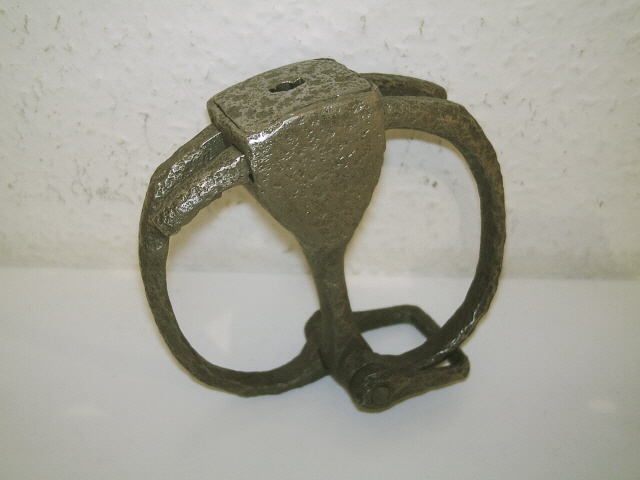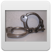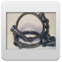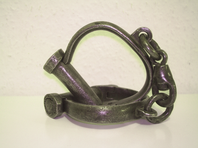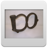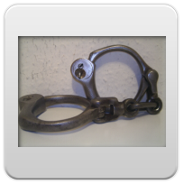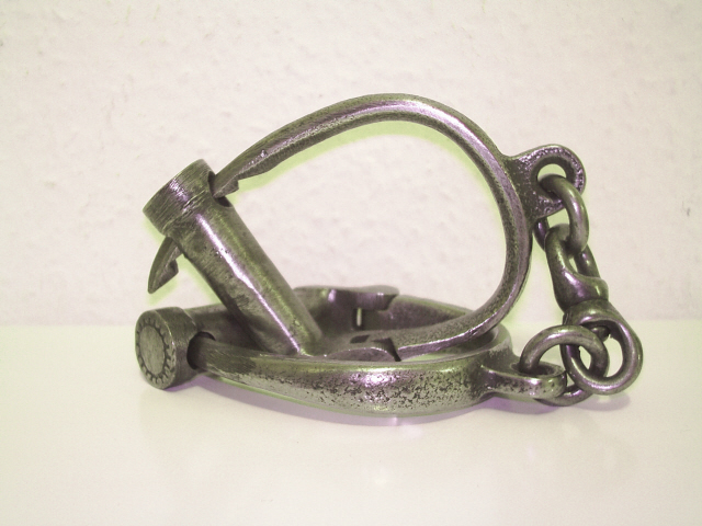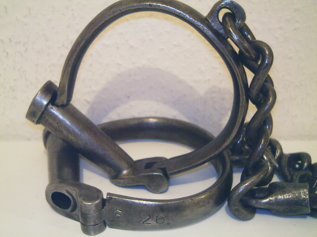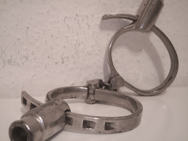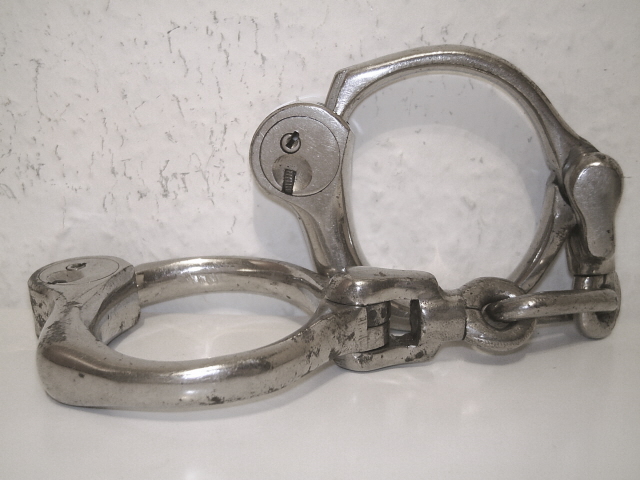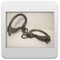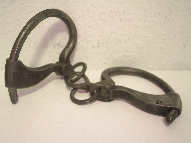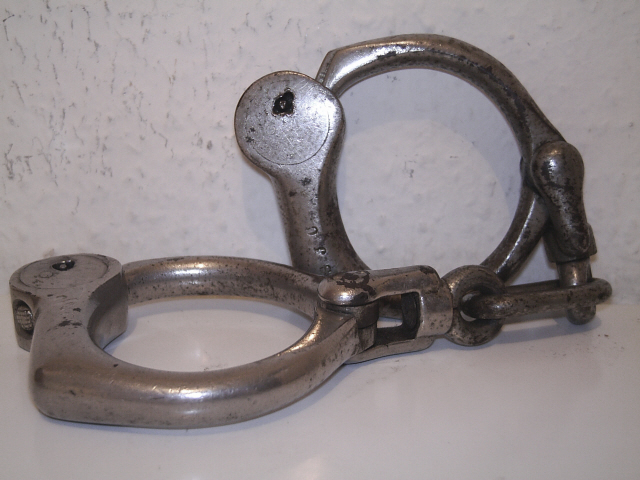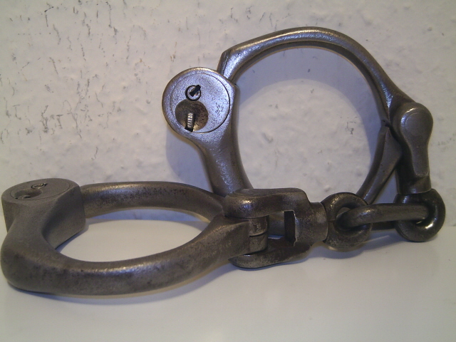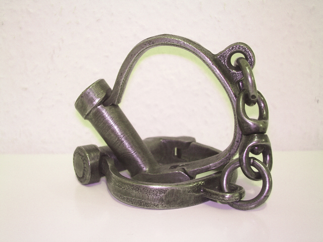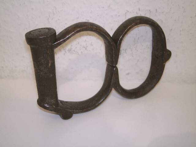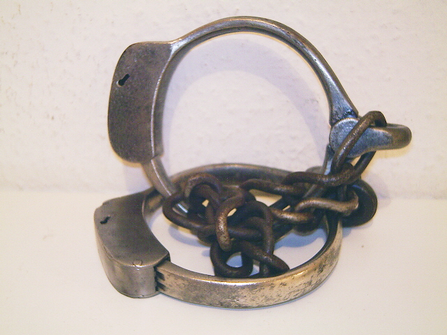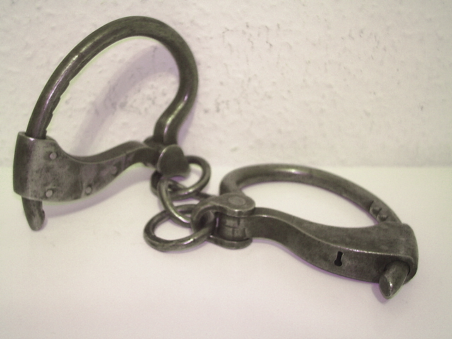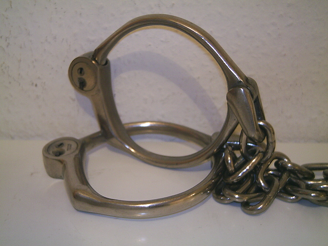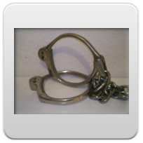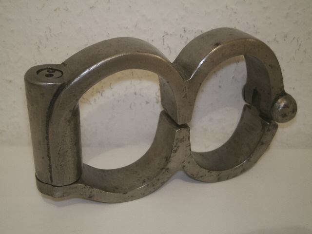 Aus dem 19. und dem 20. Jahrhundert. Sie haben außenliegende konische Schlosskästen, die auf und zu geklappt und mit einem Schraubschlüssel bedient werden. Die Verbindung ist eine Kette in Kombination mit einem Rotationsteil. Je zwei identische Schellen. Es gibt Ein-